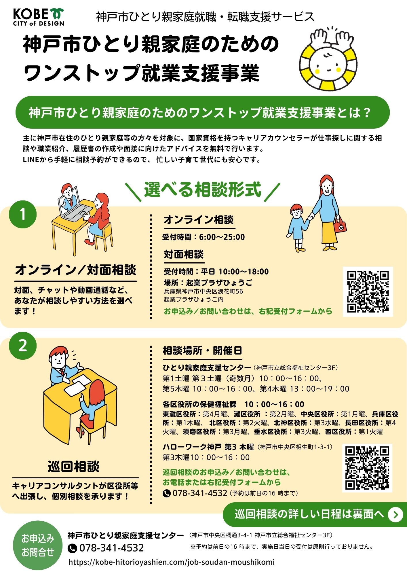 神戸市ひとり親家庭支援センター・神戸市ひとり親家庭等就業自立支援センターでは、神戸市在住のひとり親家庭(母子家庭・父子家庭)、または離婚予定の方を対象に就業相談を行っています。また月1回、各区役所(東灘・灘・中央・兵庫・北・北神・長田・須磨・垂水・西)とハローワーク神戸への巡回相談も行っています。