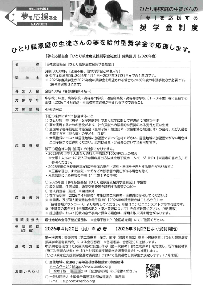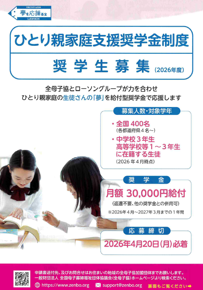 🚩奨学生募集「夢を応援基金『ひとり親家庭支援奨学金制度』(ローソン奨学金)」2026年度