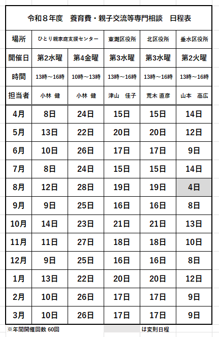離婚、養育費、親子交流、調停、家庭内の悩みごとなど、離婚前後の子どもの養育に関する手続きのご案内を、専門相談員が対応します。相談内容は固く守られますので安心して相談してください。