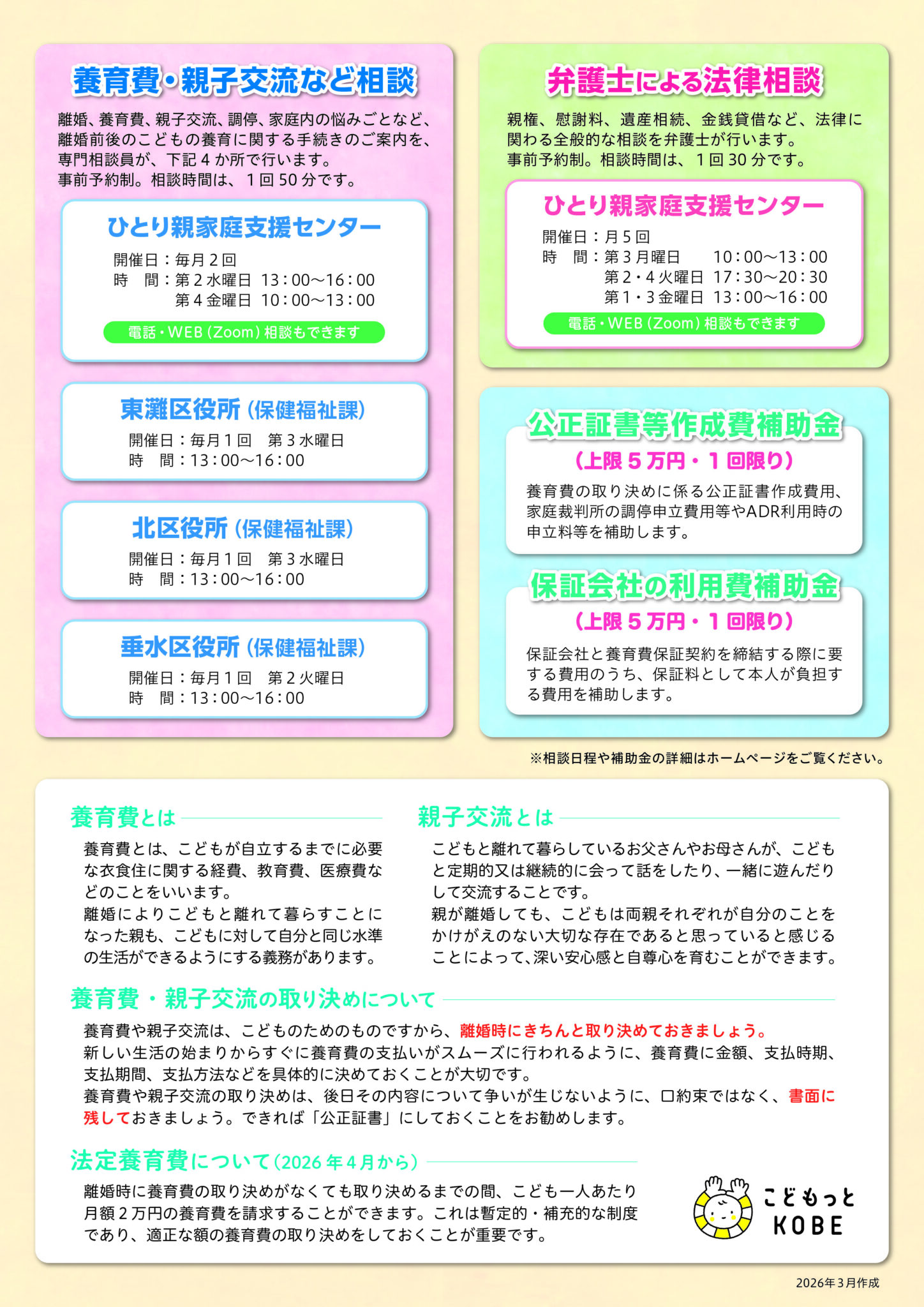 神戸市ひとり親家庭支援センターでは、確実な養育費の確保のための養育費相談や親子交流など離婚全般について相談を行っております。